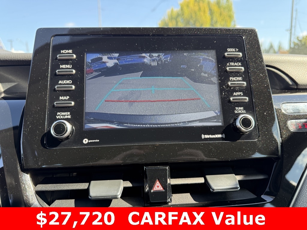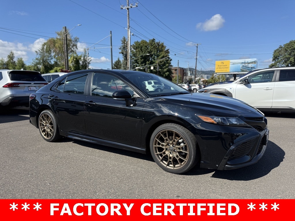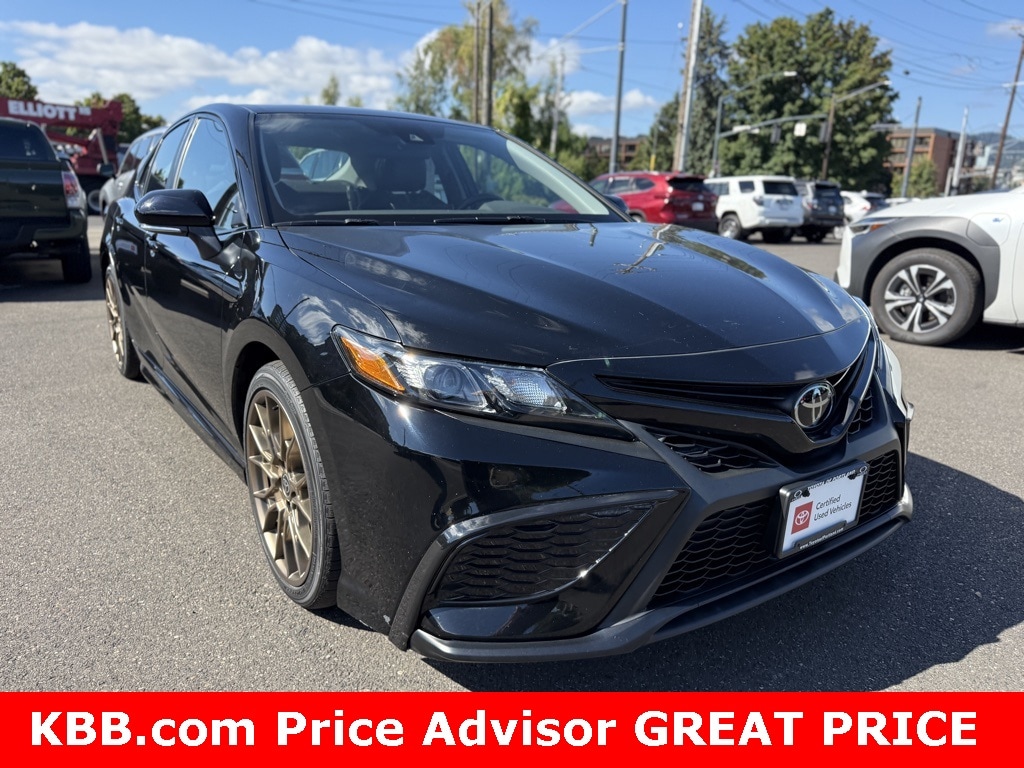 BACKUP CAMERA, COMPLIMENTARY CARFAX, LOCAL TRADE, MP3, NON-SMOKER, THIS VEHICLE IS TOYOTA CERTIFIED, Nightshade Edition, Rear Bumper Applique, Wheel Locks, 2.5L 4-Cylinder Engine 203 hp @ 6600 rpm / 184 lb-ft @ 5000 rpm 8-Speed Transmission w/Paddle Shifters Sport-Tuned Suspension, Toyota Safety Sense 2.5+: Pre-Collision Sys w/Pedestrian Detection, Dynamic Radar Cruise Control, Lane Departure Alert w/Steering Assist, Lane Tracing Assist, Automatic High Beams, Road Sign Assist Star Safety System Connected Services Capable. 4G Network Dependent. See Toyota.com for details., 19-in Matte Bronze Alloy Wheels Bi-LED Combination Headlights w/Auto On/Off Feature LED DRLs w/On/Off Feature Black Front Grille w/Sport Mesh Insert Black Mirror Caps, Shark Fin Antenna, Rear Spoiler, Window Moulding, and Rear Badges, Audio - 7-in Touchscreen, 6 Speakers, Hands-Free Bluetooth Phone/Music, USB Media Port, 2 USB Charge-Ports, SiriusXM w/3-Month Platinum Trial, Android Auto & Apple CarPlay Compatible 4.2-in TFT Multi-Information Display Sport Fabric SofTex-Trimmed Seats Power Driver Seat w/Lumbar Support Dual-Zone Auto Climate Control Remote Keyless Entry System For Full Product Details Please Visit Toyota.com/camry, Apple Car Play, Android Auto, Camry SE Nightshade, 4D Sedan, 2.5L I4 DOHC 16V, 8-Speed Automatic, Midnight Black, Black Artificial Leather, Nightshade Edition.