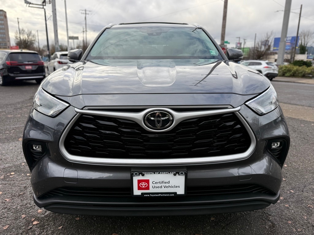 The 2023 Toyota Highlander XLE is a well-equipped SUV, finished in a sleek Magnetic Gray Metallic exterior with a black SofTex leather-trimmed interior. Powered by a 2.4L I4 turbocharged engine paired with an 8-speed automatic transmission, this all-wheel-drive vehicle offers strong performance and excellent fuel efficiency. It comes with a range of premium features, including an 8" Toyota Audio Multimedia system with 6 speakers, Apple CarPlay, Android Auto, a power moonroof, and a panoramic roof for added comfort. The vehicle also includes heated front seats, a power-adjustable driver's seat, a 3rd-row seating option, and a power liftgate for added convenience.